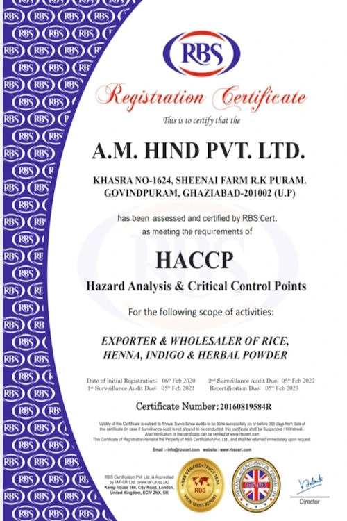 AM Hind Pvt. Ltd. is an ISO certified Indian company that deals with the worldwide export of Indian food and herbal products such as frozen meat, rice, henna, indigo.