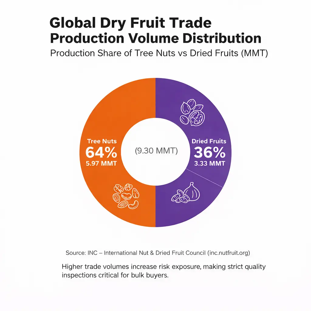 Out of roughly 9.3 million tonnes, tree nuts take the larger share. Dried fruits follow. Bigger volumes usually mean bigger risk, so buyers tend to be extra careful with inspections and handling.