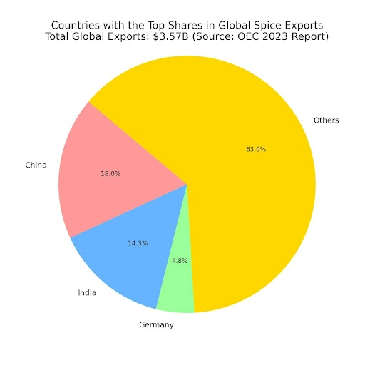 India is among the world's largest Spice Exporters. It stood second after China in global exports in 2023 as per OEC’s report. This vast and agriculturally rich country exports a wide variety of spices like red chili, black pepper, cumin, coriander, turmeric, and cardamom.